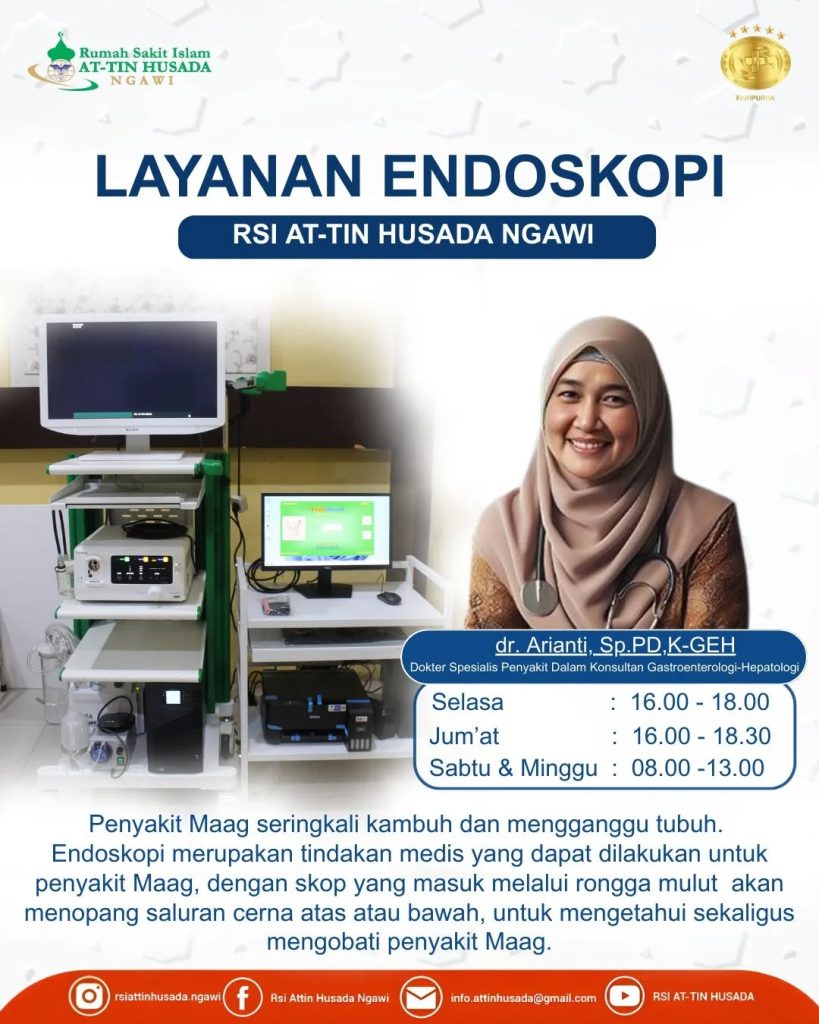 Rumah Sakit Islam (RSI) At-Tin Husada Ngawi memiliki layanan Pusat Endoskopi Saluran Cerna terbaru, yang mencakup Endoskopi Saluran Cerna Atas (Gastroskopi) untuk lambung/kerongkongan dan Endoskopi Saluran Cerna Bawah (Kolonoskopi) untuk usus besar, serta prosedur terapeutik seperti ligasi wasir dan polipektomi (pengangkatan polip) untuk deteksi dini penyakit pencernaan seperti maag kronis, GERD, hingga kanker. Layanan ini bertujuan meningkatkan diagnostik penyakit pencernaan secara akurat dengan alat modern dan tim profesional. Layanan ini melengkapi fasilitas unggulan RS At-Tin lainnya dan menerima pasien BPJS.